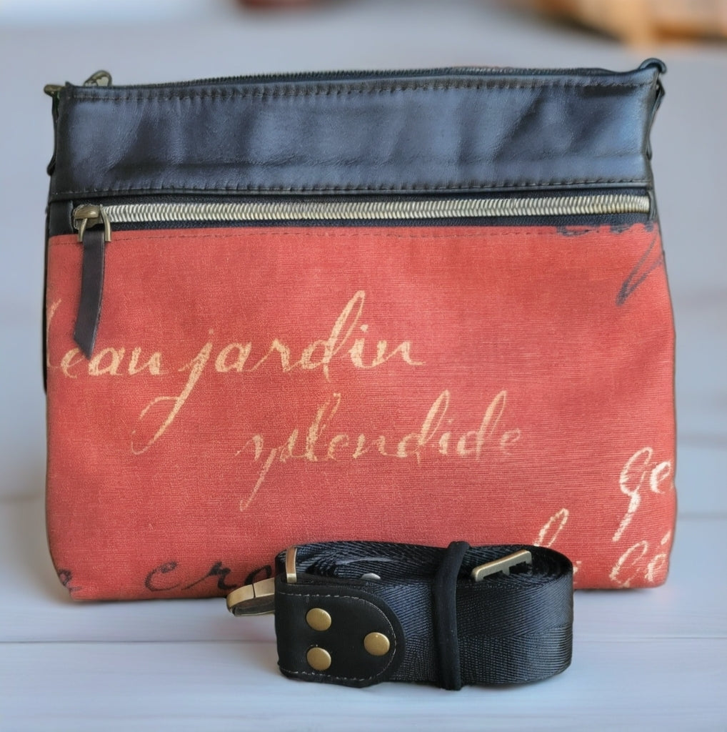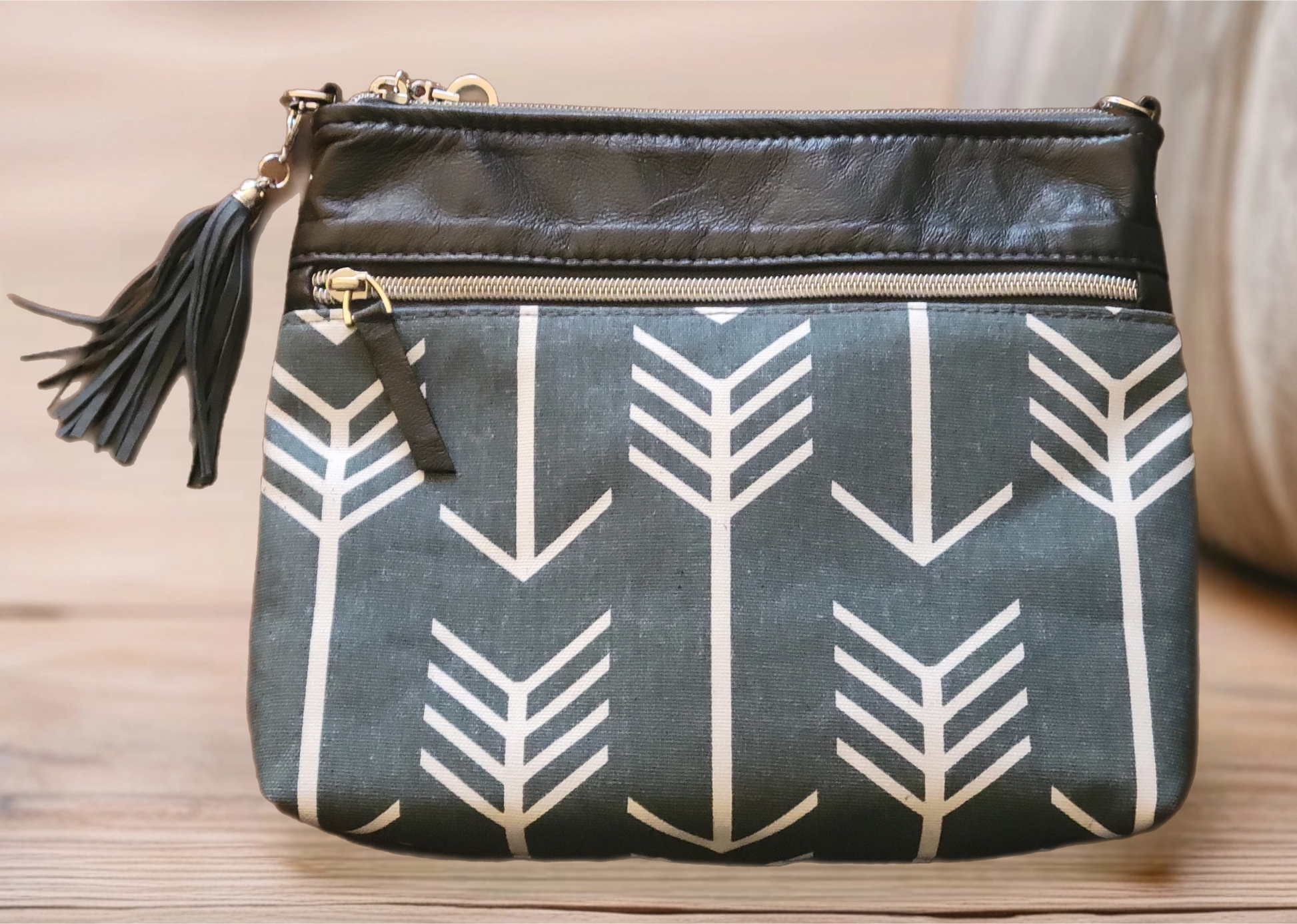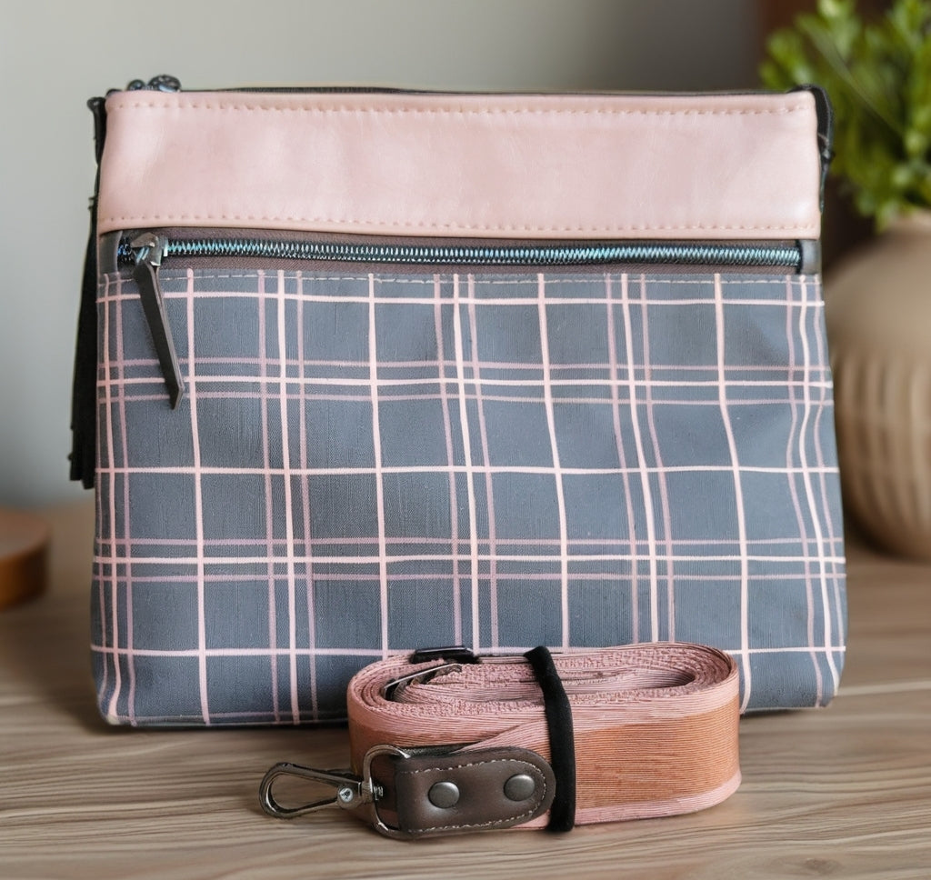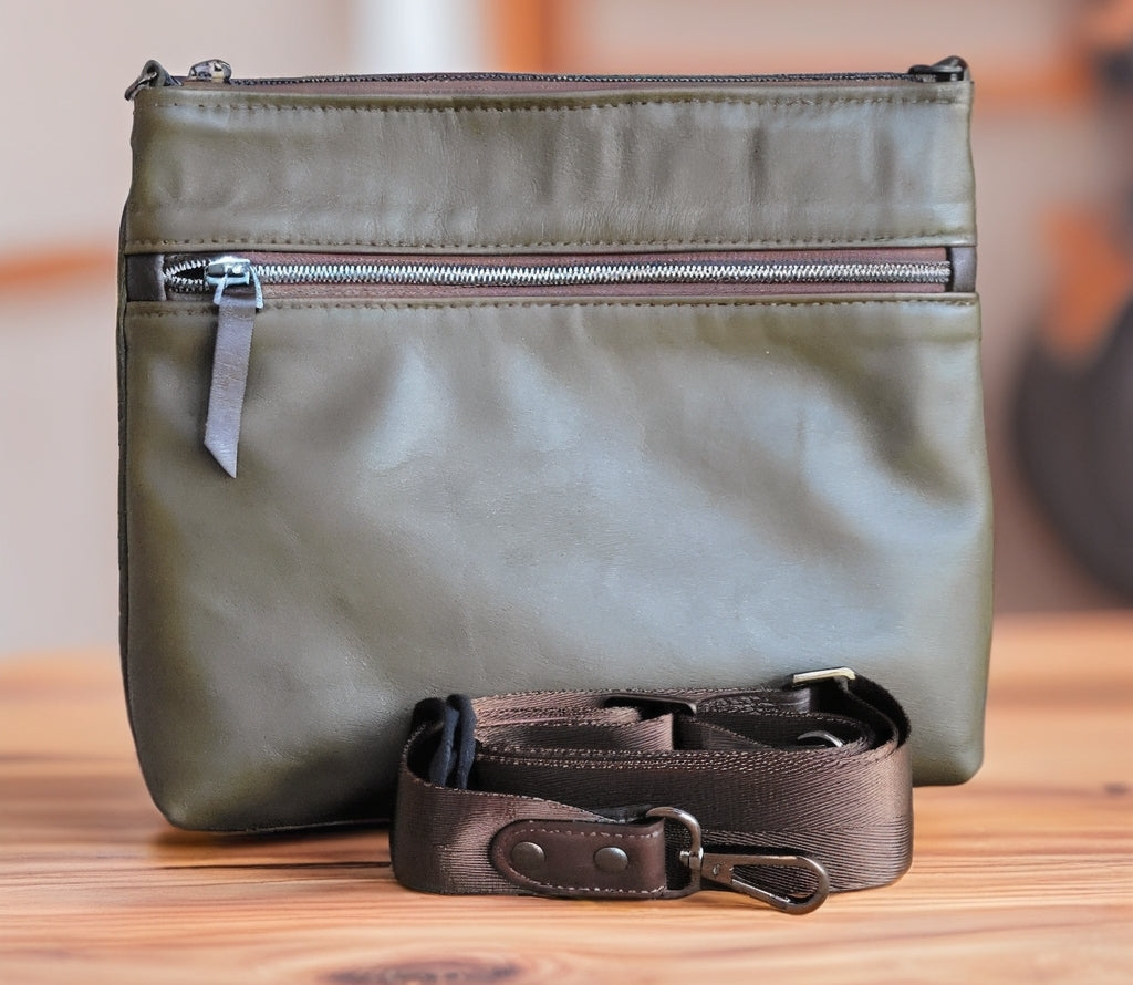 Casey offers a blend of style and practicality with its choice of design options. Front exterior zipper pocket convenient for keys and/or cell phone. An adjustable guitar-style strap is included for the boxed bottom version, and a buckle strap for the rounded corner bottom. Size 11"w x 8"h x 1/2"d.