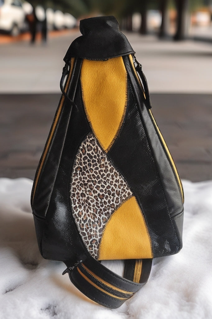 A stylish sling bag can be worn as a backpack, sling, or crossbody. The exterior has a back zippered pocket. Access to the interior via a zipper from either side. The interior has a zippered pocket.