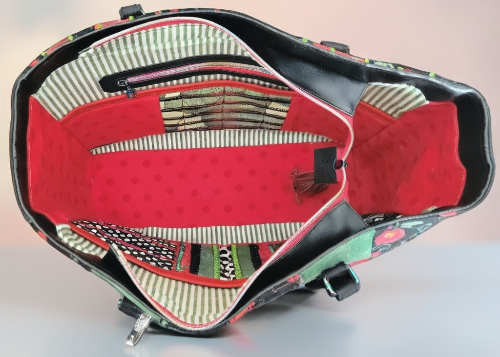A fun and functional statement bag! This bag is upcycled using almost all of a previous tote with the addition of black cork for more stability and style. The exterior features sectioned slip pockets behind the cork. The interior has been constructed from the previous tote's interior, along with some decorative exterior panels. The interior includes slip pockets on both sides and a zipper pocket.