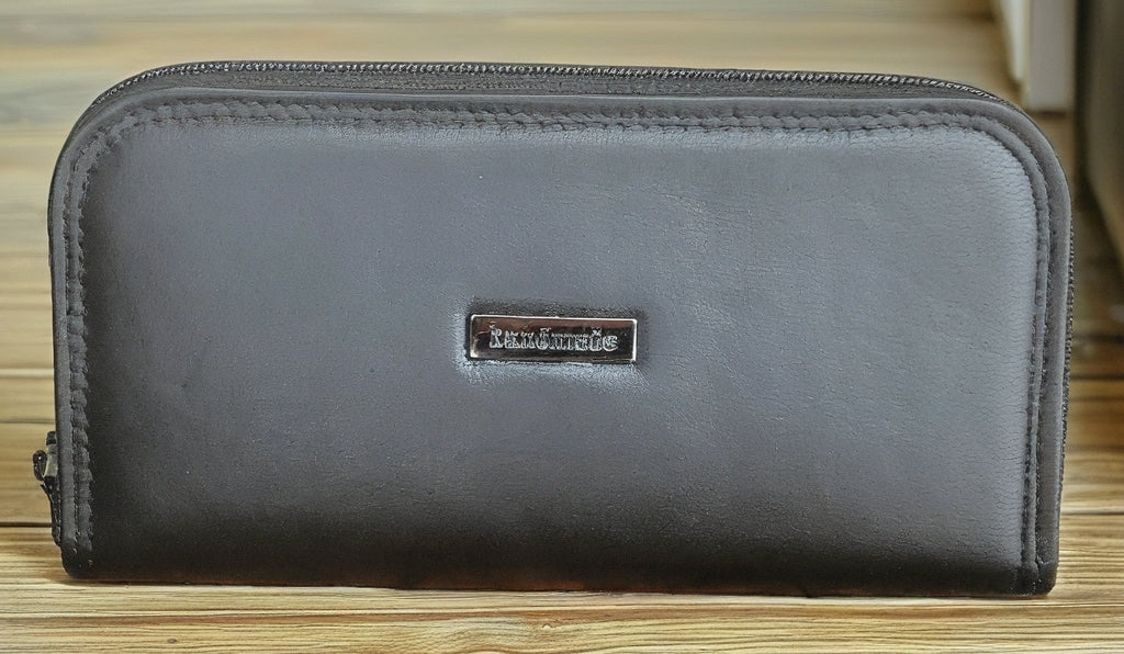 Zip around wallet. Leather exterior, cotton interior. Size 8 1/2" x 4" x 1". Contains 12 card slots and a coin/cash zippered pouch. Same size as similar designer wallets.